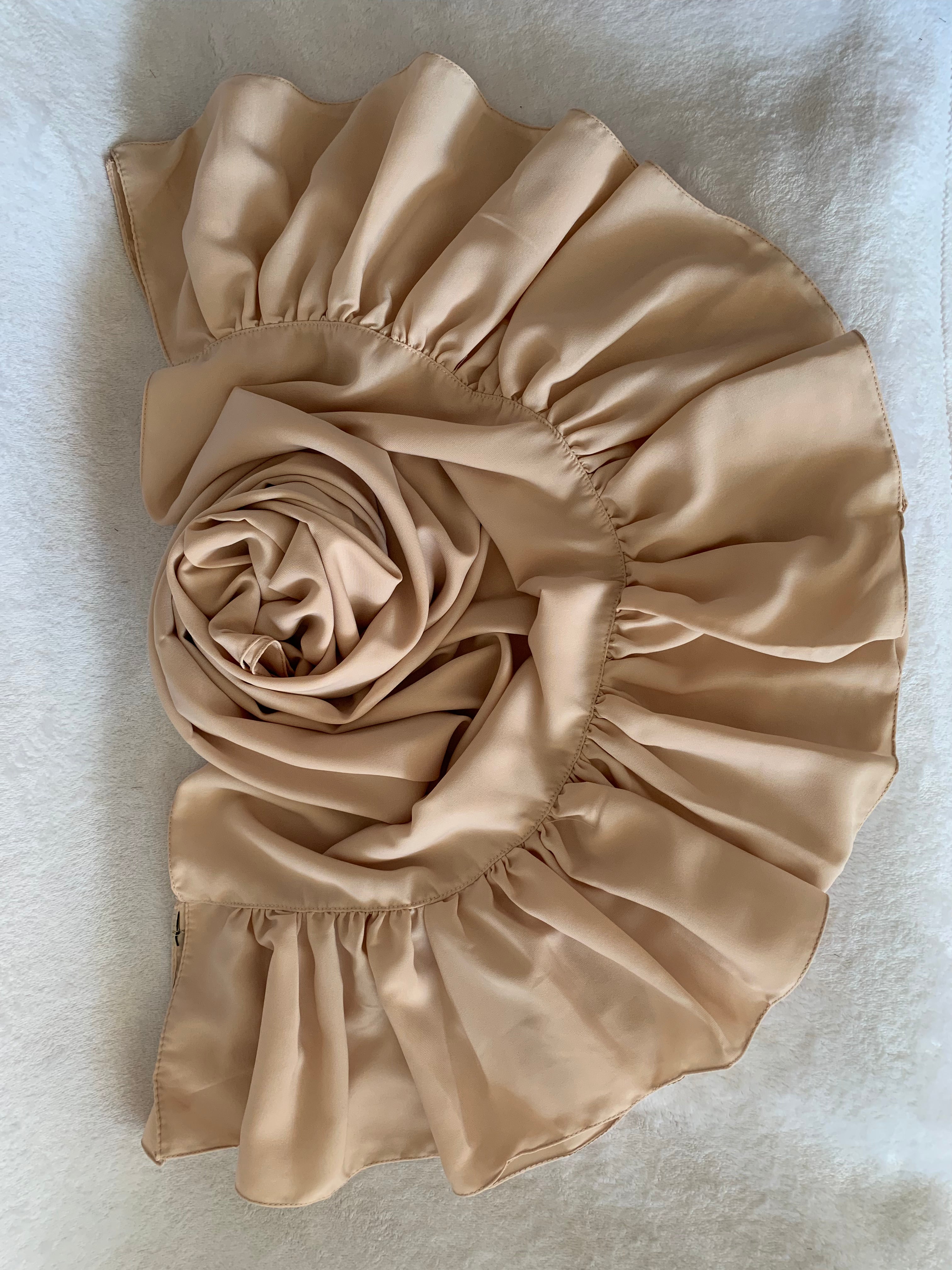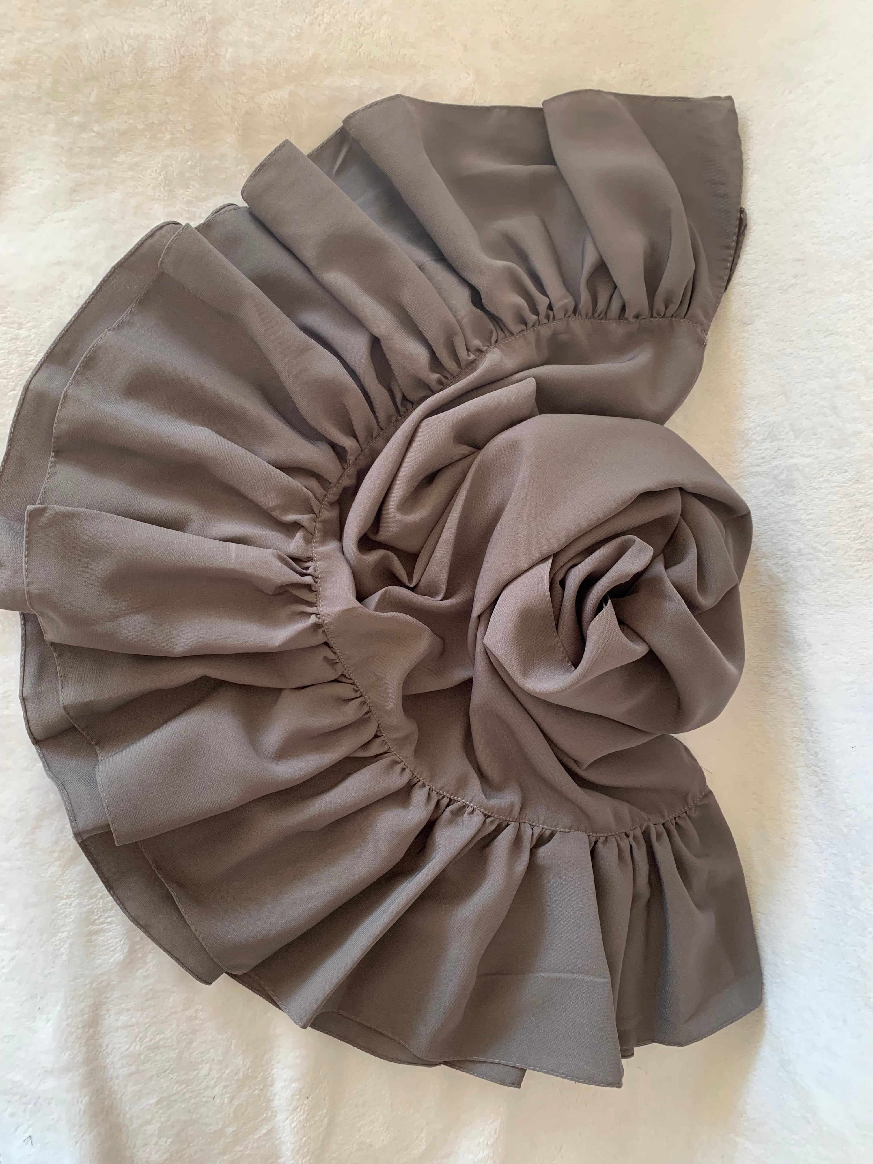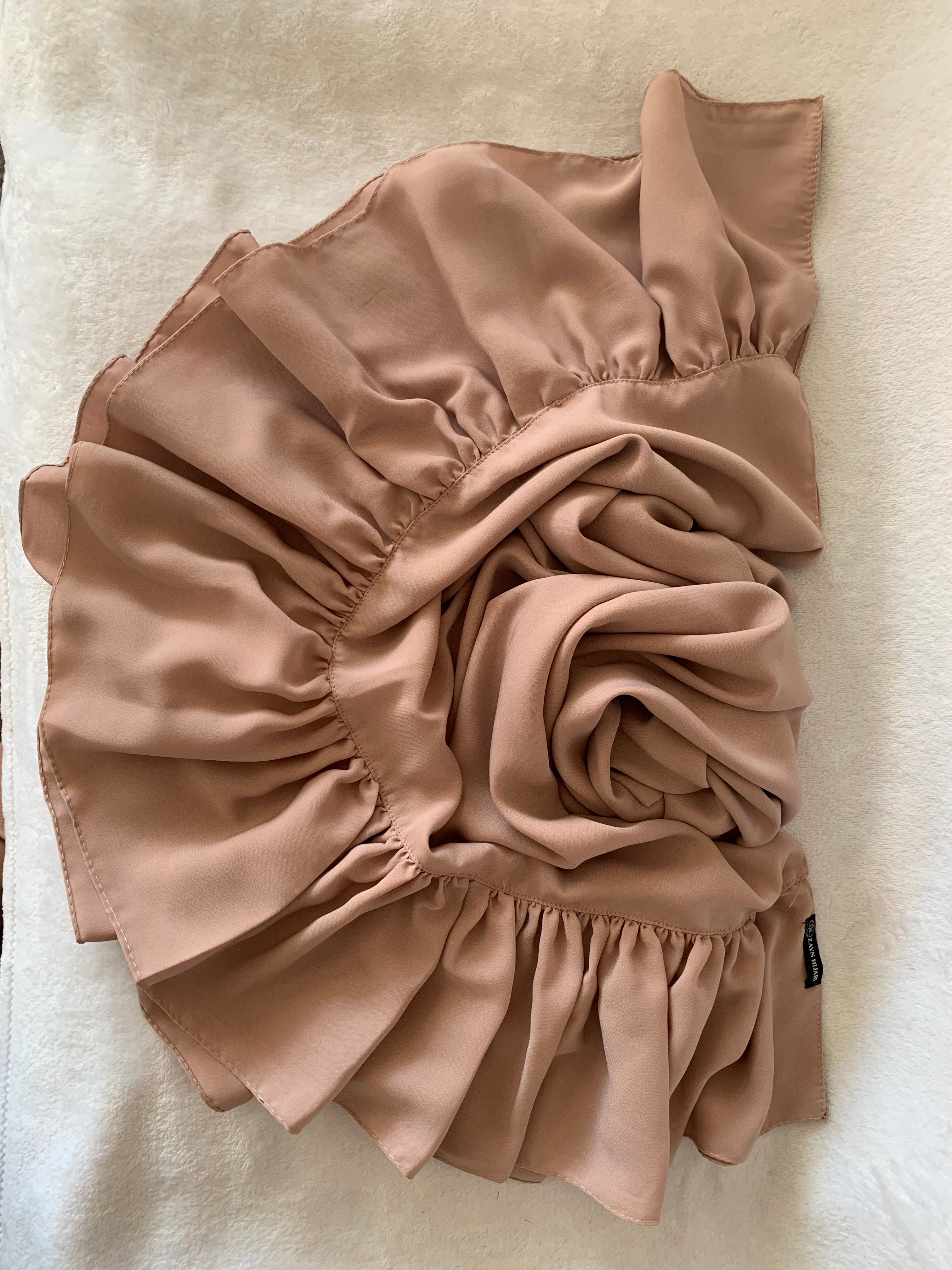 Description: Our ruffle hijabs are made in Medina Chiffon, a completely opaque, soft, and high-quality fabric that doesn't slip when worn without an undercap. It washes very well (as long as you don't put it in the dryer!) The ruffles on this hijab are featured on both small ends, making the ways to to style this hijab boundless!