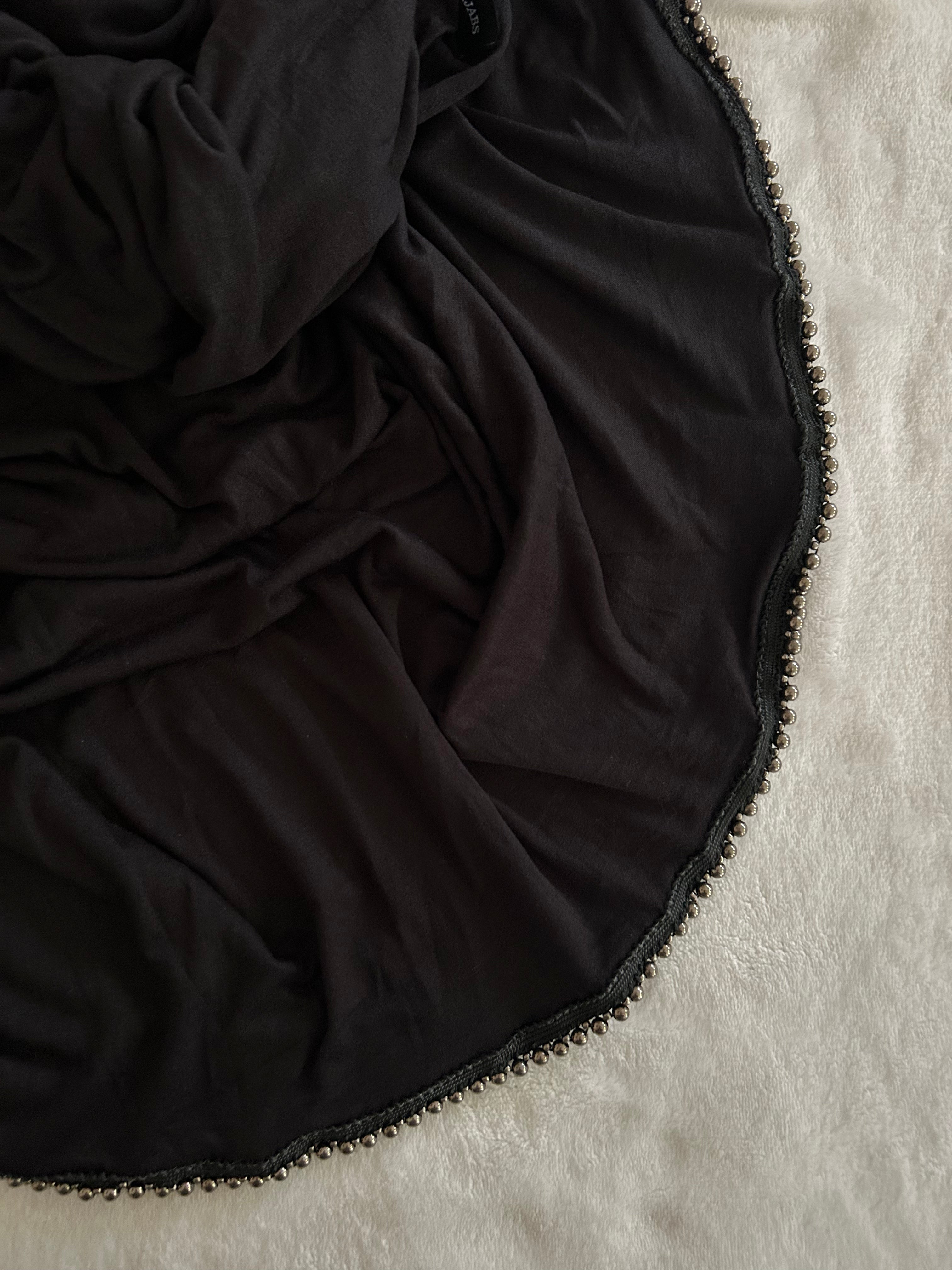 Description: The most buttery soft jersey with onyx beads on both ends. Perfect for those who cannot be bothered with pins and magnets, because these stay put without anything! These are perfect for teens and up - and can be styled in so many ways!