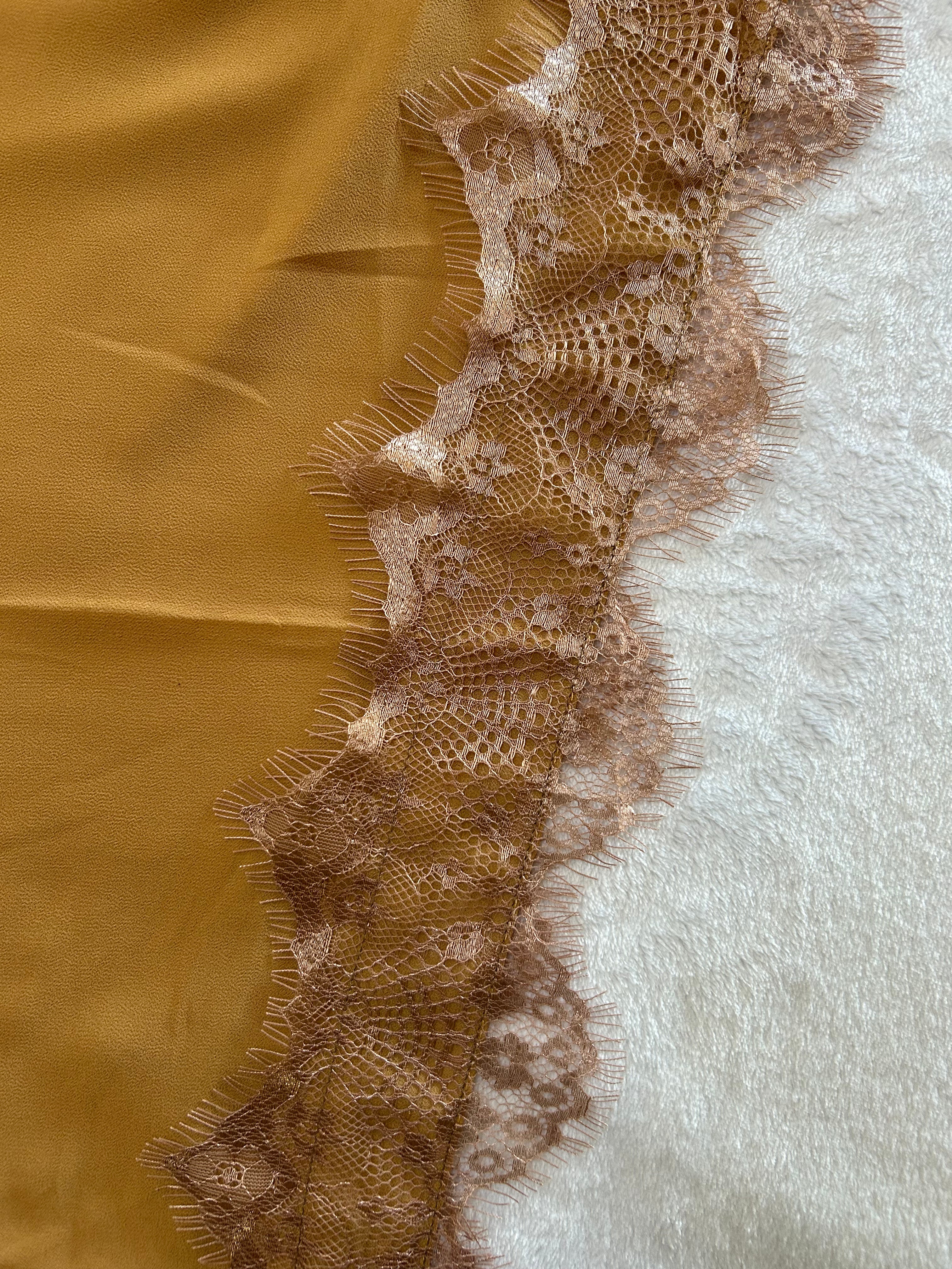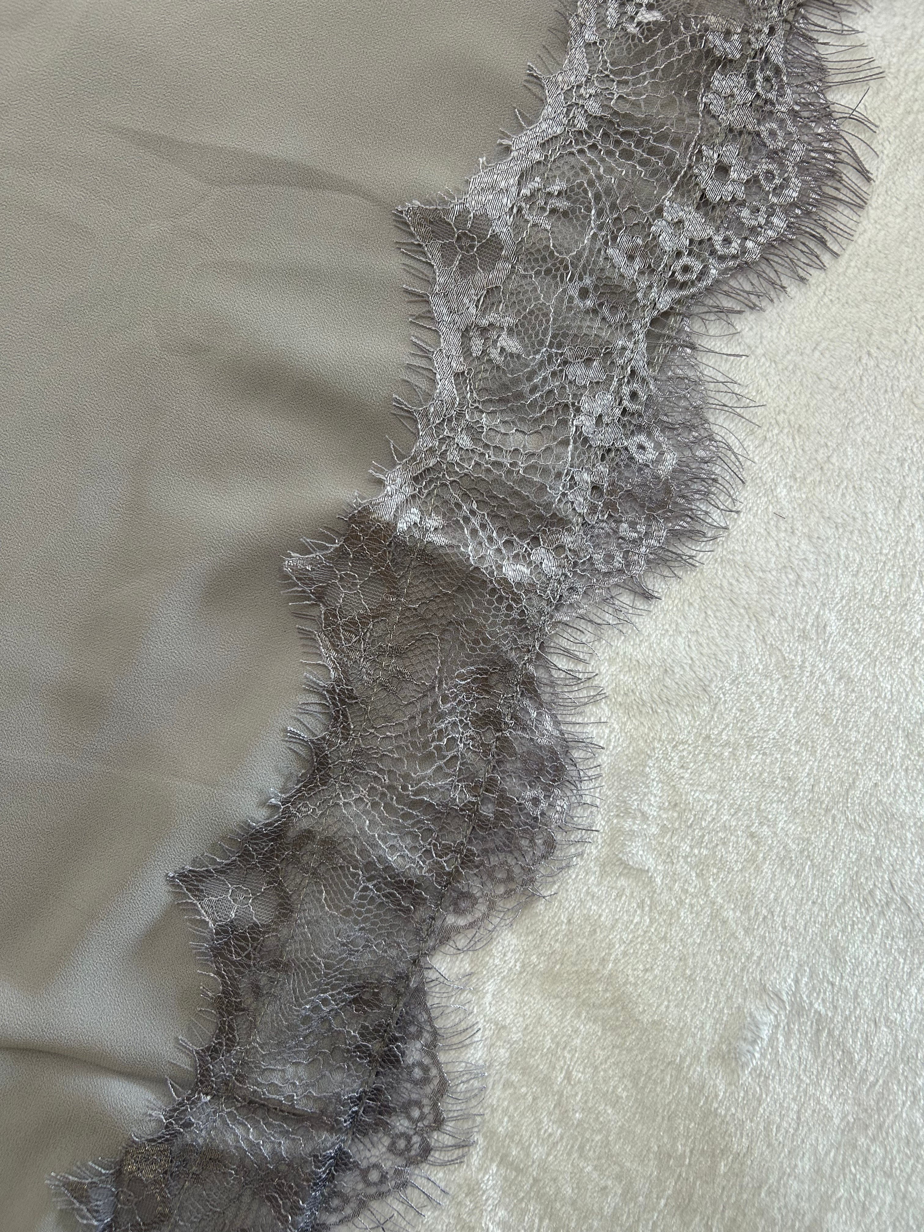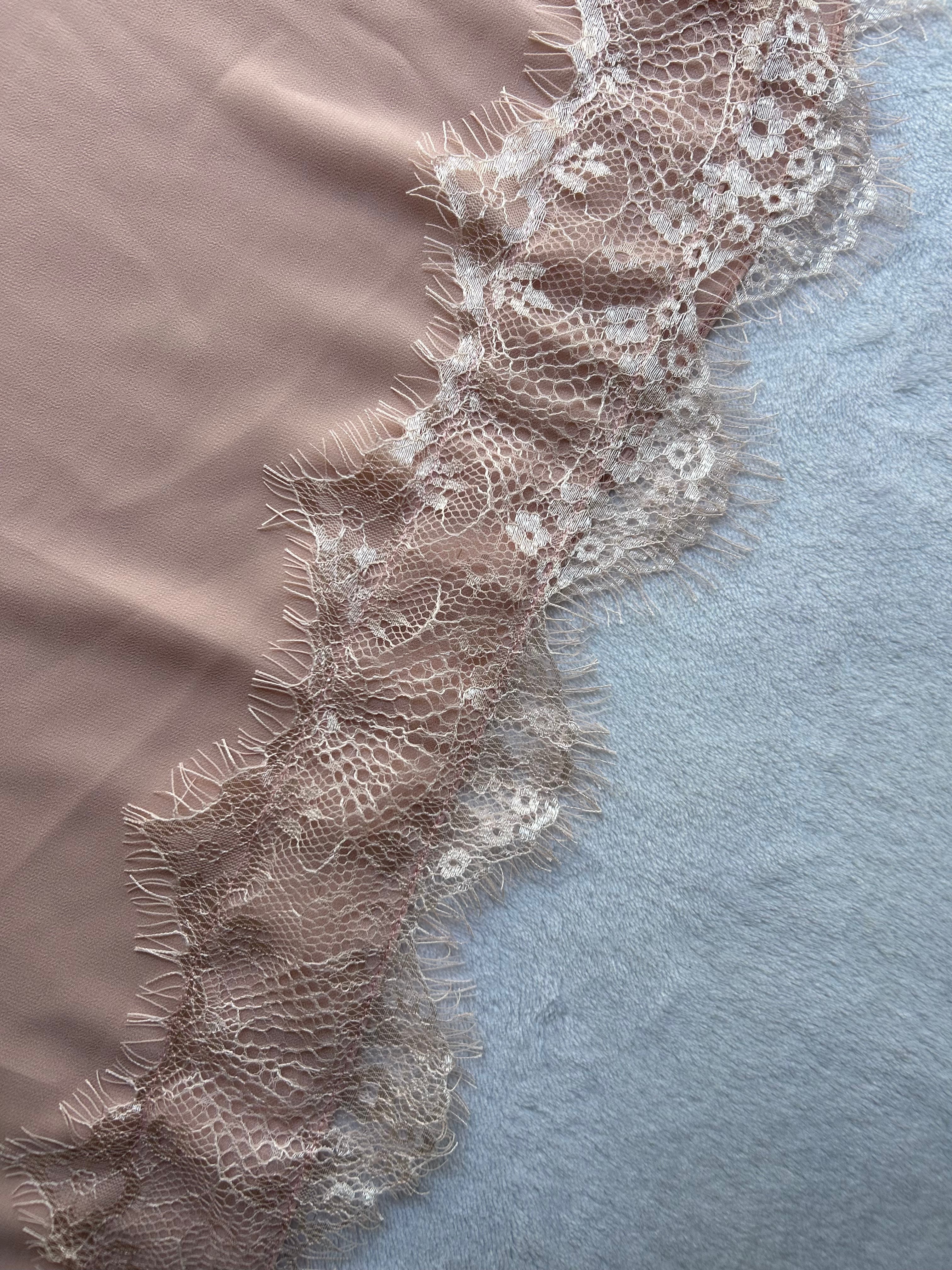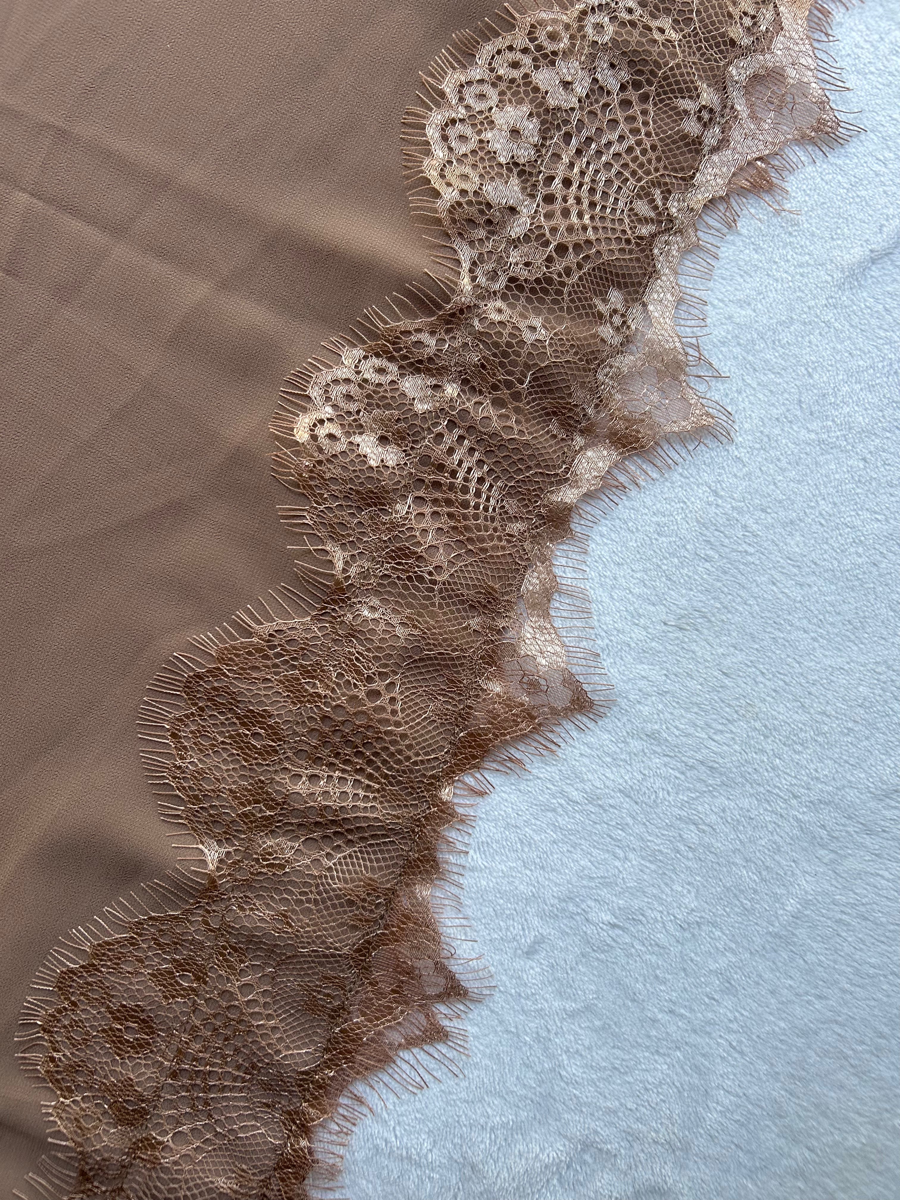 Description: Our Premium Chiffon with a chic lace trim on one long edge. Dress up any outfit with this soft lace finish!